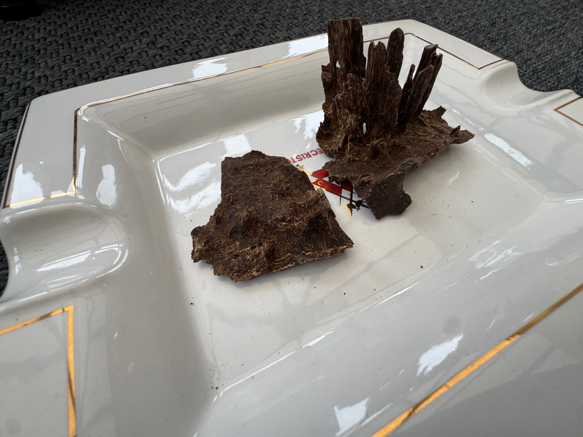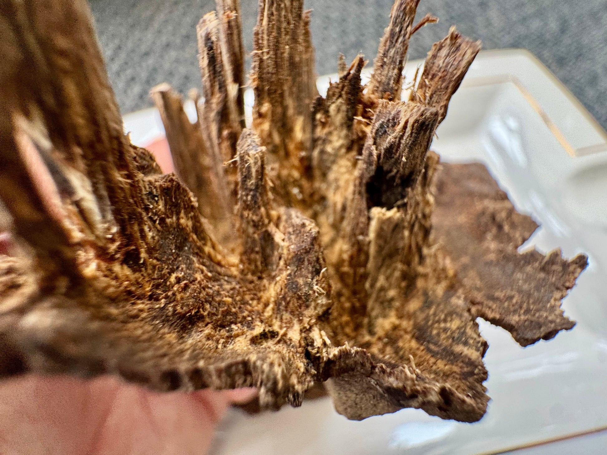 Char is created from a stump wound, this could have been created naturally or ‘wild harvest’ style by chopping the tree. Just like agarwood sticks , char can be faily unclean (internal white dead wood) or very resinous. This particular batch is pretty resinated with an obvious dark appearance to the internal flesh and sticky resinous wood externally. the aroma is fairly strong cinimon / spicy Hindi.